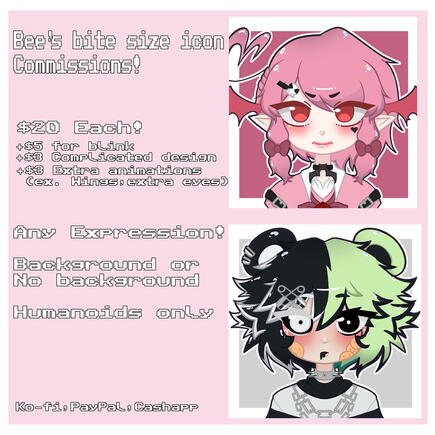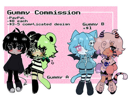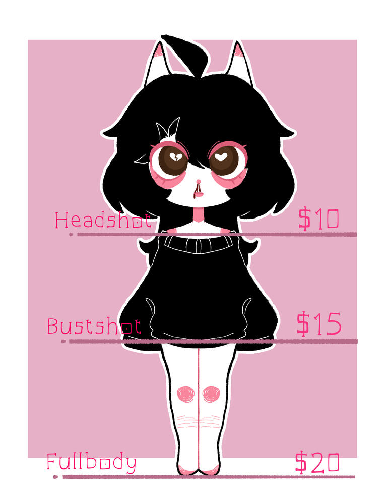 PayPal only. Commissions open once a week to a month for up to 1-2 person